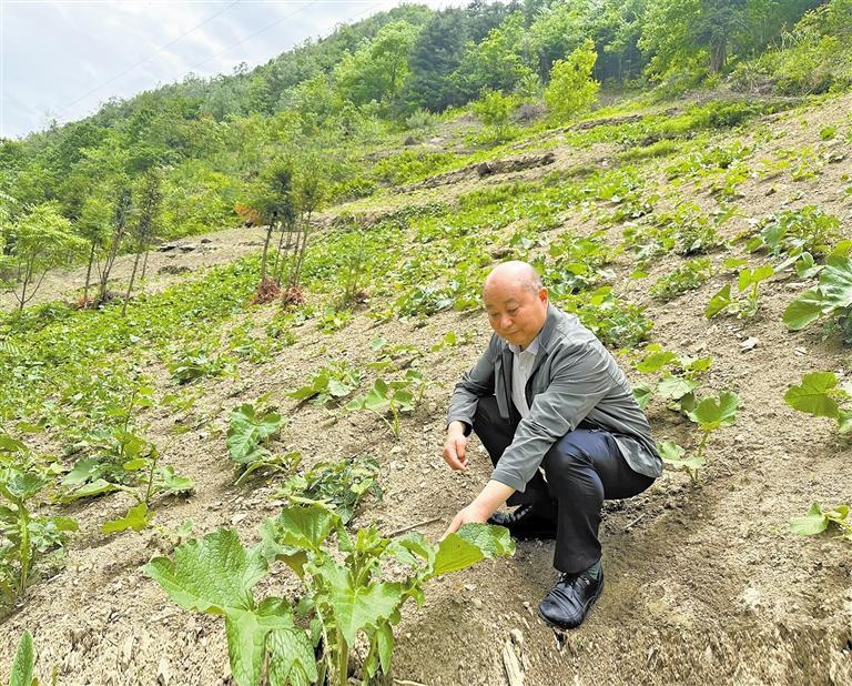 5月14日,龙甫林查看云木香长势。 本报记者 齐珂雨摄