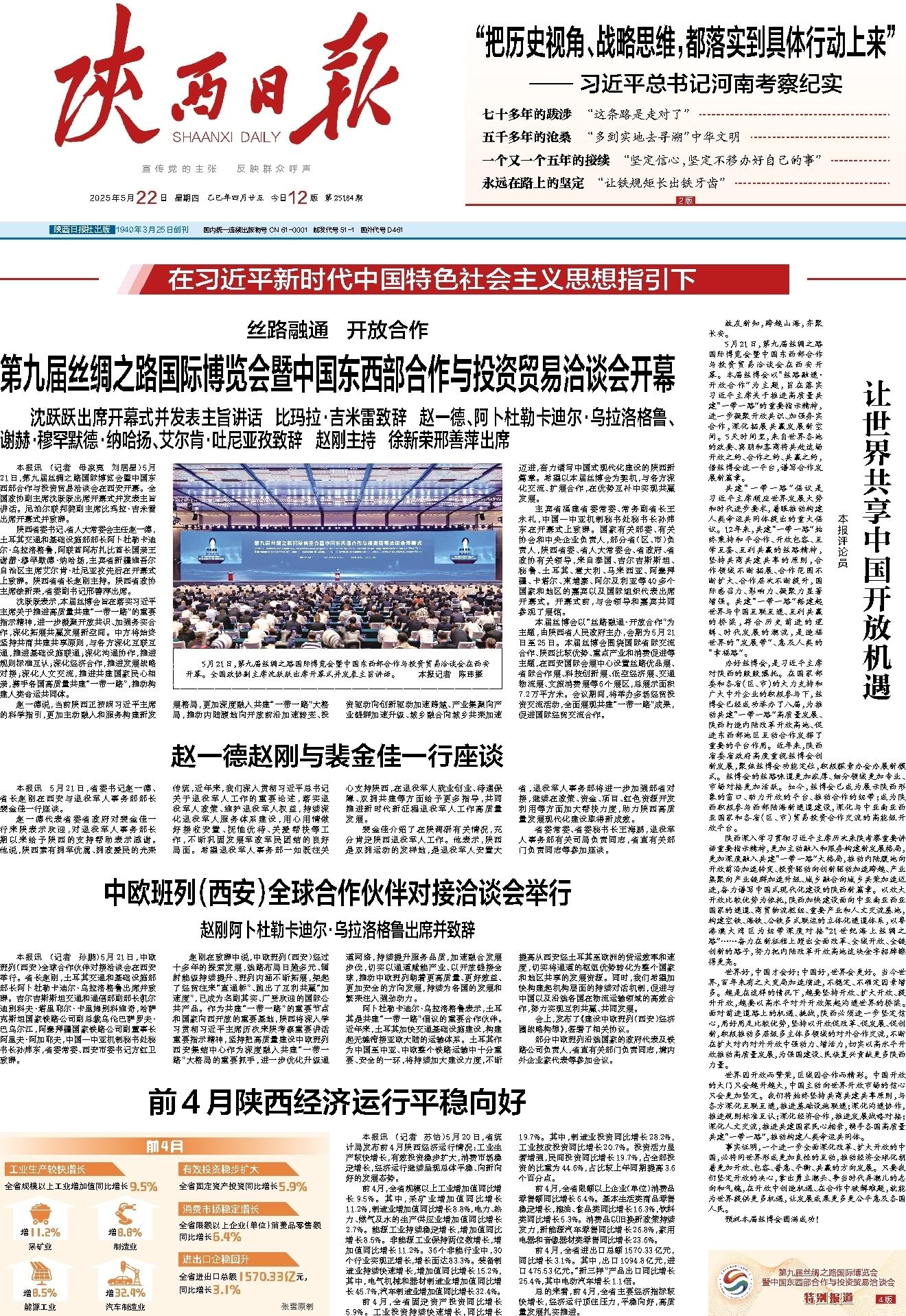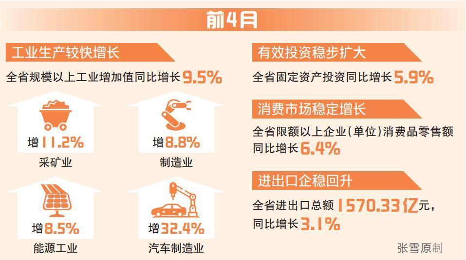 本报讯 (记者 苏怡)5月20日,省统计局发布前4月陕西经济运行情况:工业生产较快增长,有效投资稳步扩大,消费市场稳定增长,经济运行继续呈现总体平稳、向新向好的发展态势。