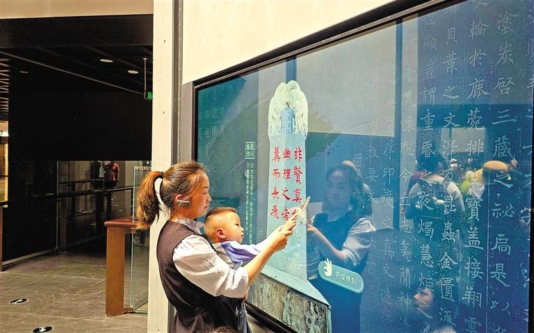 5月14日,不少游客与展品旁的多媒体装置互动。“屏幕上能够显示碑刻的详细信息和书法风格。针对不同的碑刻,有的互动装置还能给纹饰上色、临摹汉字,互动感很强。”西安市民张瑜说。