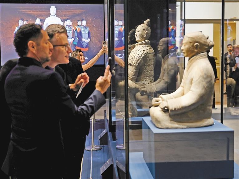 5月22日,嘉宾在美国加利福尼亚州奥兰治县宝尔博物馆欣赏兵马俑展品。
