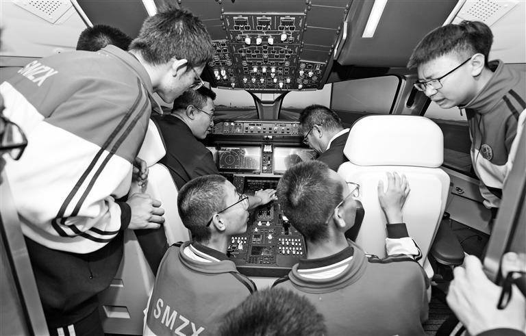 神木中学学生参观C919飞机模拟舱。