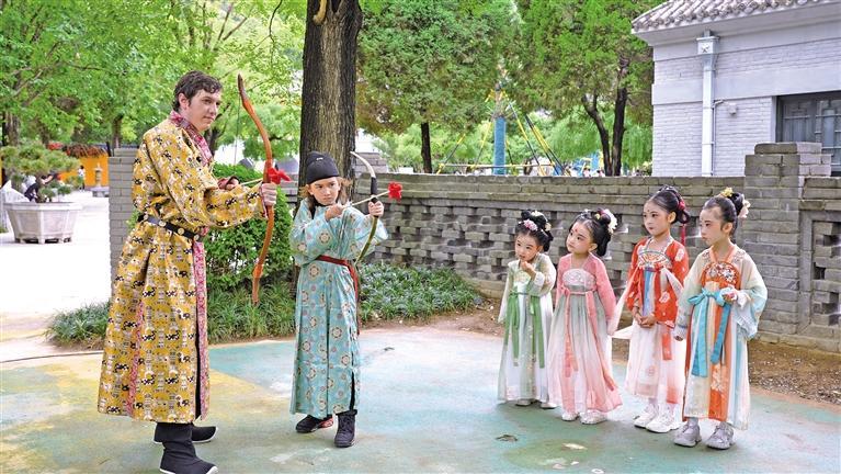 5月31日,西安市临潼区华清宫景区推出“穿越千年盛唐,共度诗意端午”主题活动。中外小朋友身着汉服,体验“射粉团”游戏。本报通讯员 王三合摄
