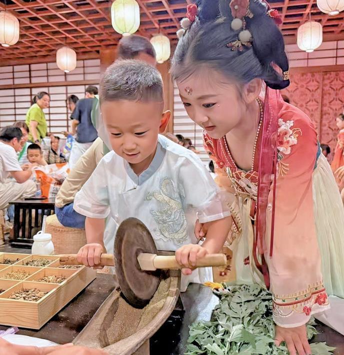 5月31日,小朋友参加西安市长安十二时辰主题街区举办的“粽香童趣·漫长安”系列活动,现场体验香囊制作。本报记者 蒲茜摄