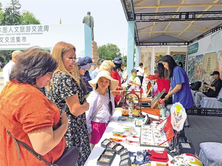 “太漂亮了,谢谢。”收到中方赠送的端午绣花香囊,阿拉木图市民连声感谢。6月2日上午,人文旅游交流周人文交流市集活动在阿拉木图共和国广场举行。中医药知识普及、非遗展示等丰富多彩的活动吸引了众多当地民众观看。被誉为“立体绣花”“线艺雕塑”的精美缠花、水上作画的唐流彩、小巧精致的鼻烟壶内画等作品让观众连声赞叹。婀娜多姿的唐风舞蹈将盛唐风韵展现给阿拉木图市民。八段锦的演示,让台下的观众情不自禁地跟着比划起来。穿上精美的汉服,阿拉木图年轻的姑娘连忙招呼同伴给自己拍照。