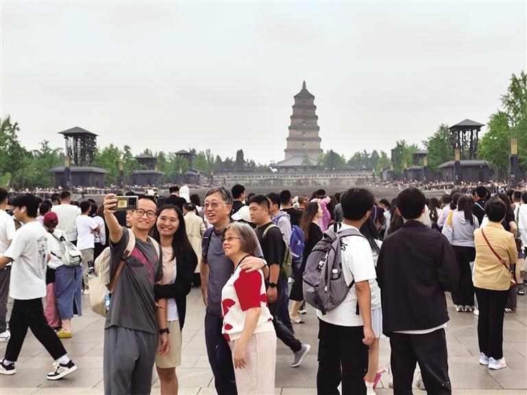 端午假期,西安各景区游人如织,热闹非凡。图为6月1日傍晚,游客在大雁塔景区游览。 本报通讯员 李建龙摄
