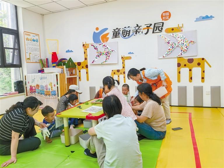 5月30日,在莲湖区红庙坡街道梨园社区服务站,群众带孩子上早教课。