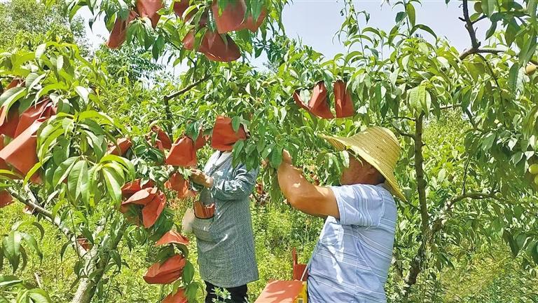 汉阴县双乳镇江河村黄桃种植基地的120余亩黄桃即将迎来采摘期。图为近日,果农在管护果园。 本报通讯员 王文艺摄