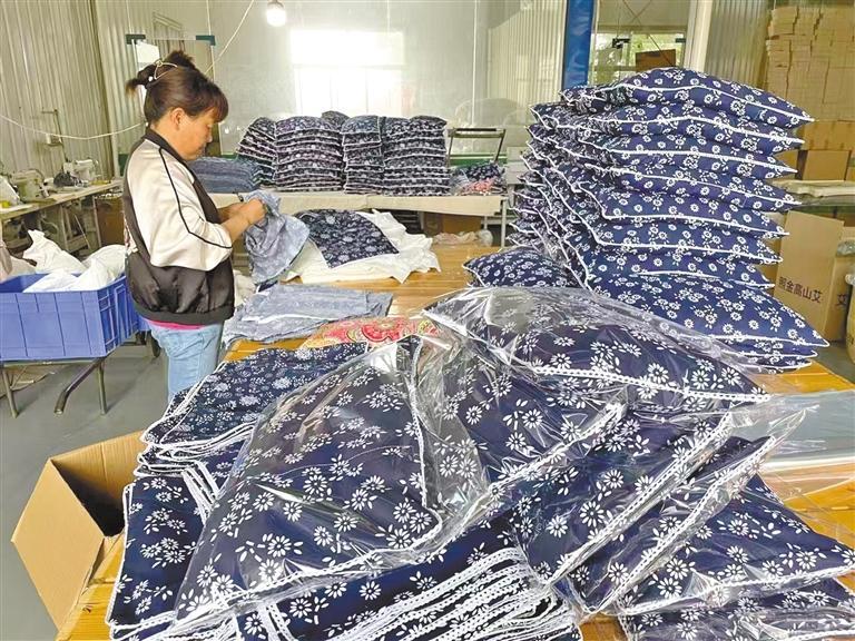 5月22日,高尔塬村村民在工厂缝制艾绒坐垫。 本报通讯员 张芳摄