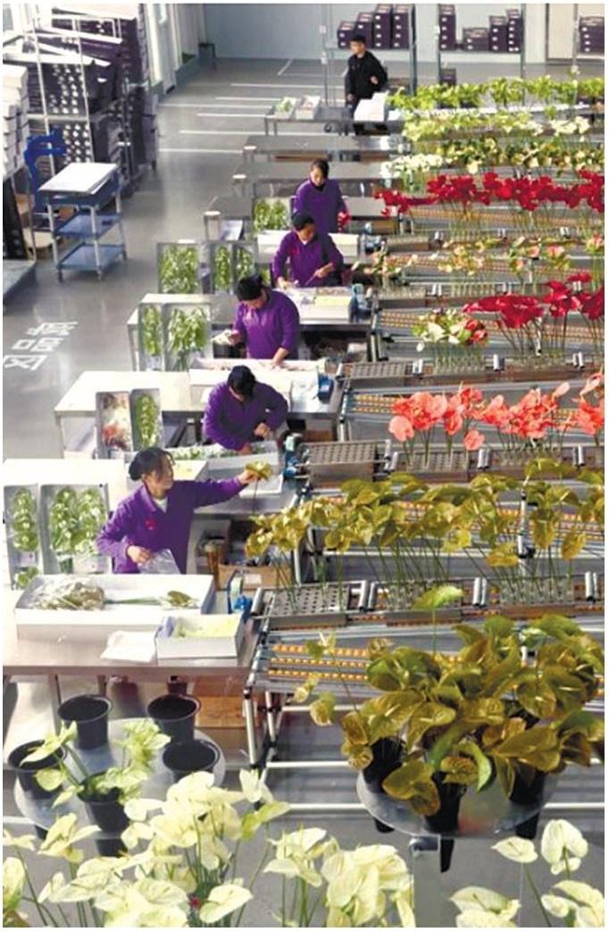 5月26日,位于西咸新区泾河新城的陕西伊翡园艺科技有限公司(以下简称“伊翡园艺”)里一片繁忙景象,工人在温室里打包装箱鲜切花。