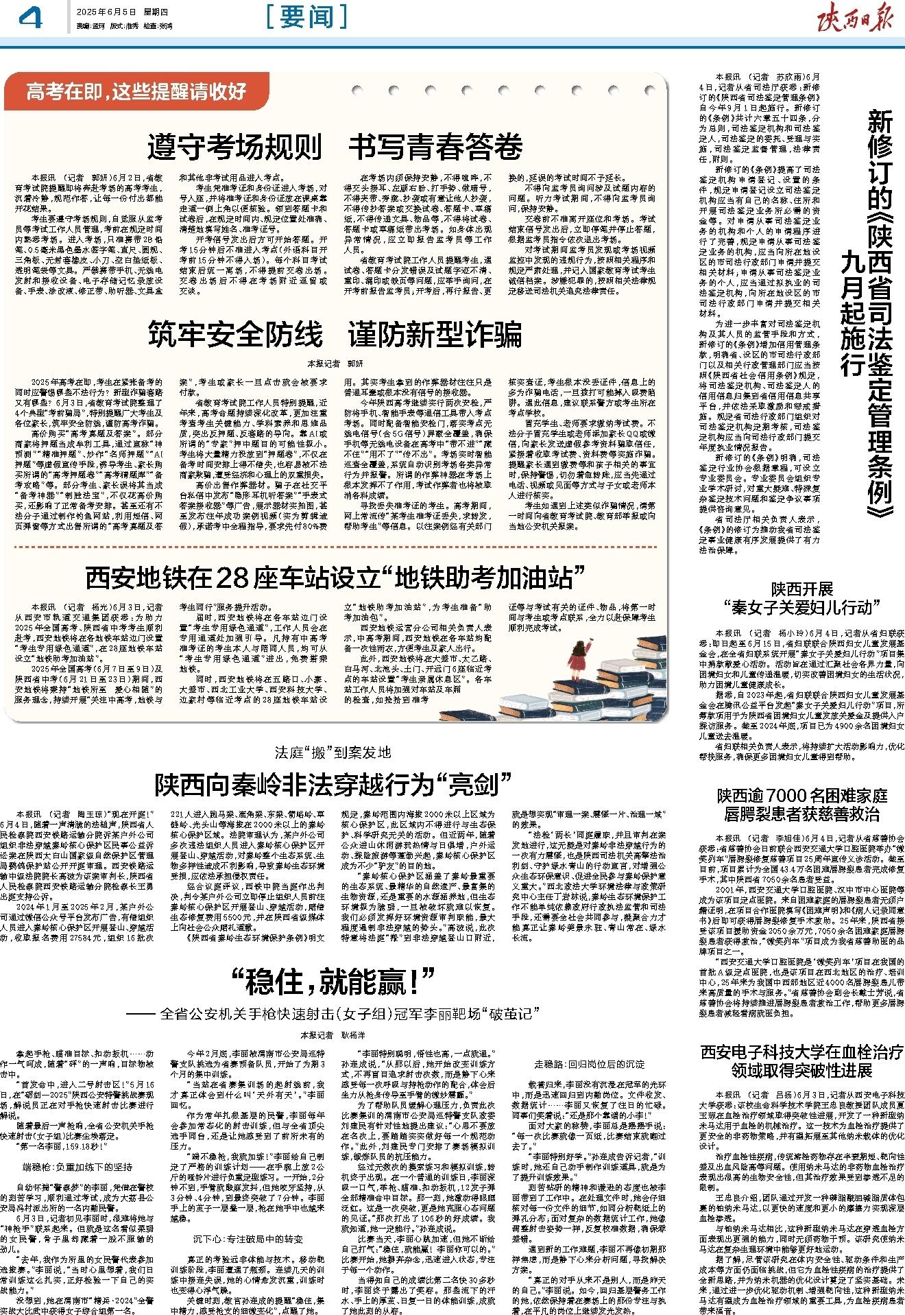 本报讯 (记者 杨光)6月3日,记者从西安市轨道交通集团获悉:为助力2025年全国高考、陕西省中考考生顺利赴考,西安地铁将在各地铁车站边门设置“考生专用绿色通道”,在28座地铁车站设立“地铁助考加油站”。