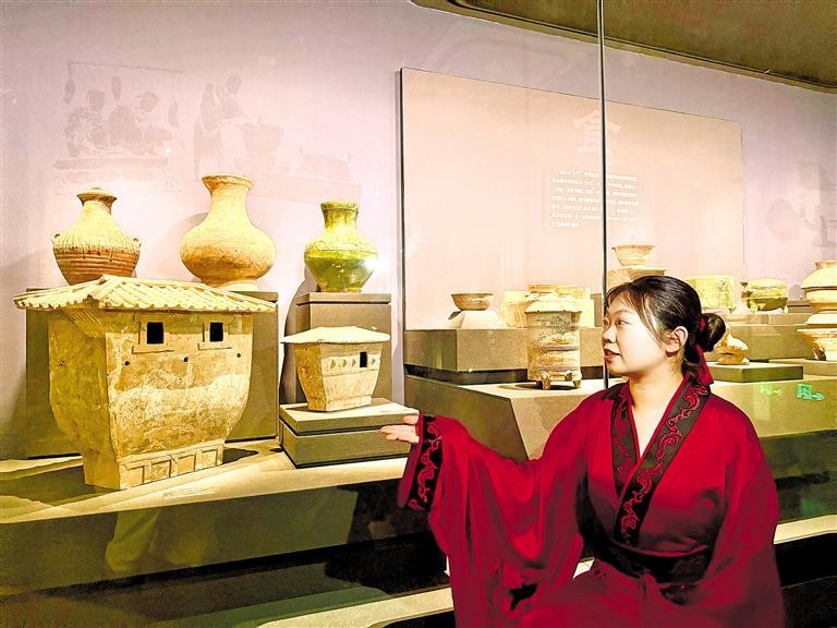 汉景帝阳陵博物院讲解员贺婧楠介绍房屋形陶仓。