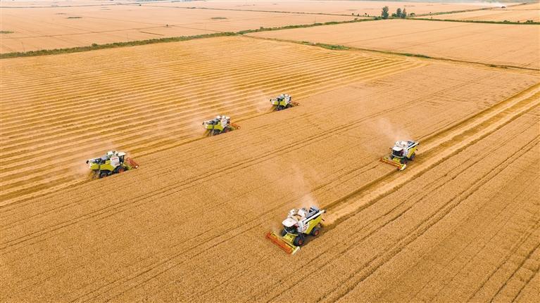 6月6日,在陕西农垦沙苑农场的一处农田,联合收割机在收割小麦。 本报记者 许奥博摄