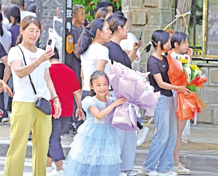 6月8日,在延长县高级中学考点外,小朋友手捧花束迎接走出考场的考生。 本报通讯员 王福建摄