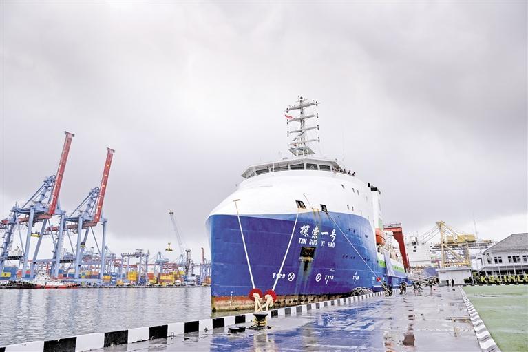 这是2024年3月22日在印度尼西亚雅加达拍摄的停靠在丹戎不碌港的“探索一号”科考船。中国科学院深海科学与工程研究所与印度尼西亚国家研究创新署2024年3月23日顺利完成为期一个月的爪哇海沟联合科考。 新华社记者 徐钦摄
