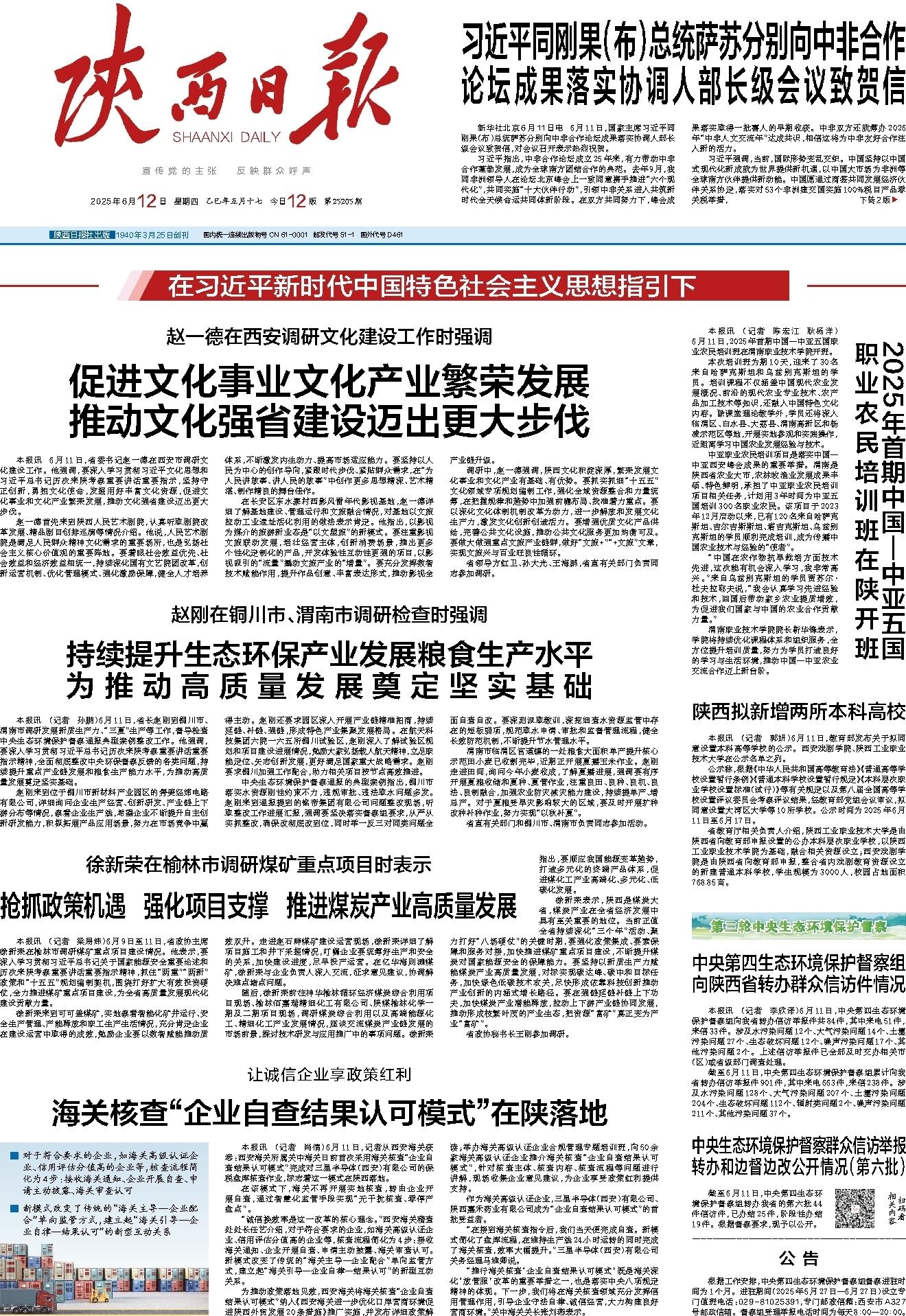 调研中,赵一德强调,陕西文化积淀深厚,繁荣发展文化事业和文化产业有基础、有优势。要抓实抓细“十五五”文化领域专项规划编制工作,强化全域资源整合和力量统筹,在把握规律和趋势中加强前瞻布局、找准着力重点。要以深化文化体制机制改革为动力,进一步解放和发展文化生产力,激发文化创新创造活力。要增强优质文化产品供给,完善公共文化设施,推动公共文化服务更加均衡可及。要做大做强重点文旅产业链群,做好“文旅+”“+文旅”文章,实现文旅兴与百业旺良性循环。