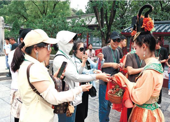 6月14日,在西安市临潼区华清宫景区,“唐宫仕女”为游客送上岭南荔枝。 本报记者 蒲茜摄
