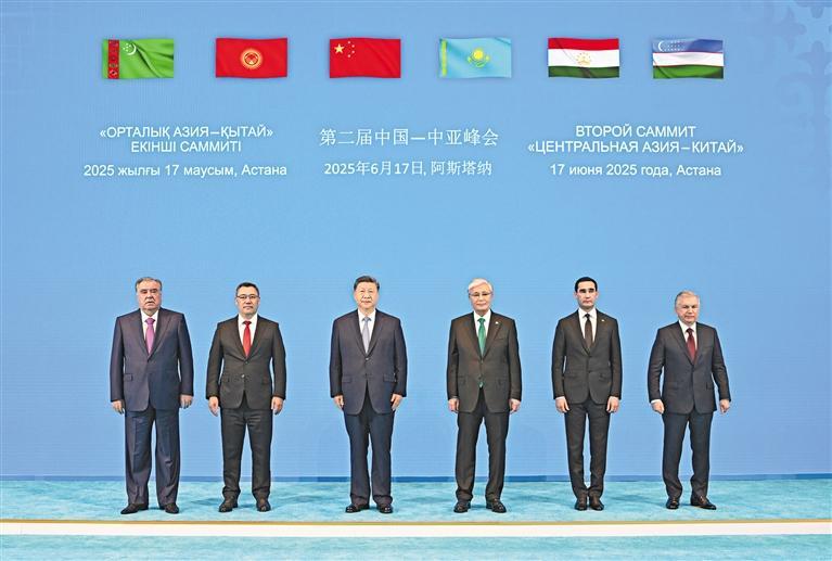 当地时间6月17日下午,第二届中国—中亚峰会在阿斯塔纳独立宫举行。哈萨克斯坦总统托卡耶夫主持会议。中国国家主席习近平、吉尔吉斯斯坦总统扎帕罗夫、塔吉克斯坦总统拉赫蒙、土库曼斯坦总统别尔德穆哈梅多夫、乌兹别克斯坦总统米尔济约耶夫出席。这是习近平同中亚五国元首集体合影。 新华社记者 谢环驰摄