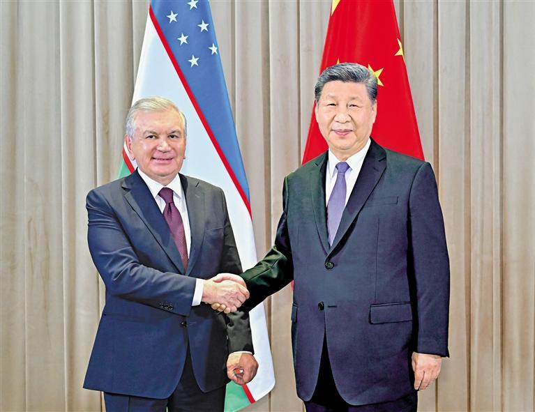 当地时间六月十七日上午,国家主席习近平在阿斯塔纳出席第二届中国—中亚峰会期间会见乌兹别克斯坦总统米尔济约耶夫。 新华社记者 翟健岚摄