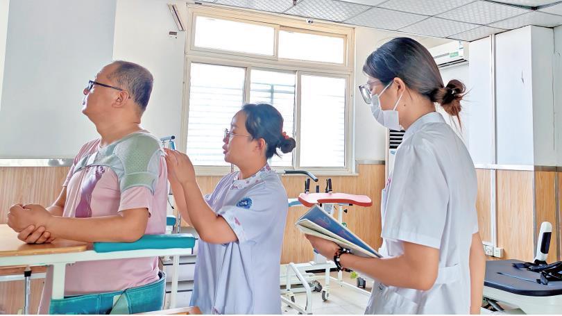 六月十二日,在咸阳市第一人民医院,咸阳职业技术学院护理专业学生陈王鸽(右一)跟随护师学习为患者穿戴肩部矫形器。