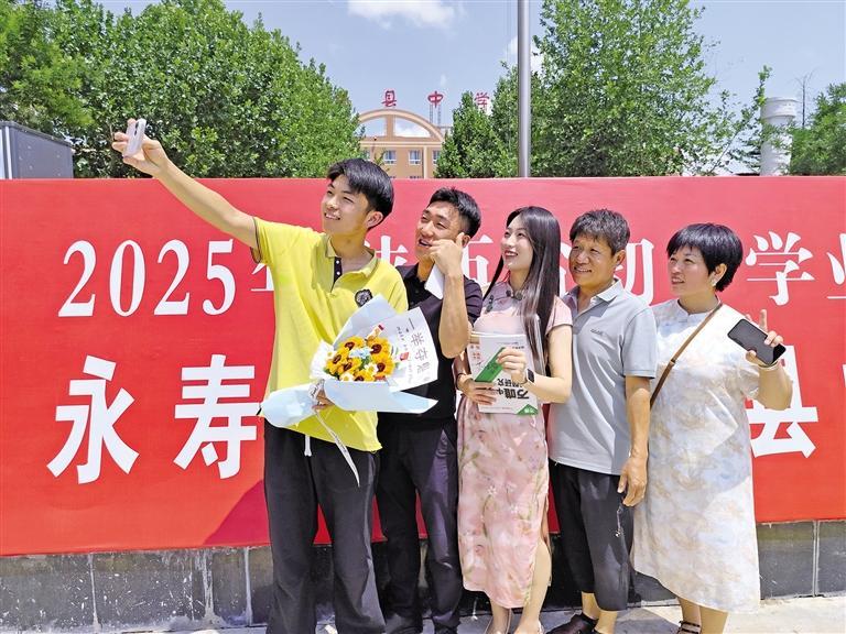 6月23日,2025年陕西省初中学业水平考试结束。图为当日中午,考生与家长在永寿县中学考点门前合影。 本报通讯员 李建龙摄