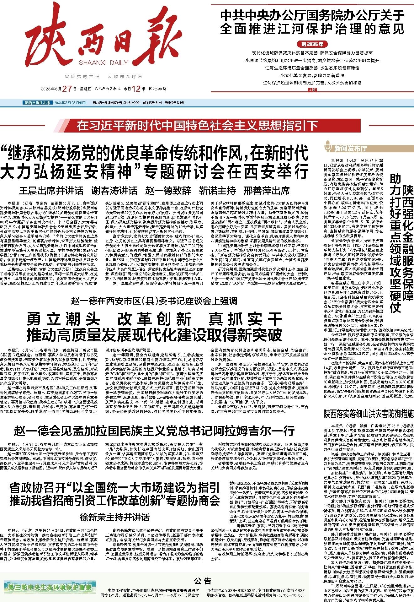 本报讯 6月26日,省委书记赵一德主持召开西安市区(县)委书记座谈会。他强调,要深入学习贯彻习近平总书记历次来陕考察、来西安考察重要讲话重要指示精神,扎实开展深入贯彻中央八项规定精神学习教育,持续深化“三个年”活动,聚力打好“八场硬仗”,大力发展县域经济、民营经济、开放型经济、数字经济,勇立潮头、改革创新、真抓实干,推动高质量发展现代化建设取得新突破,为谱写陕西新篇、争做西部示范作出更大贡献。