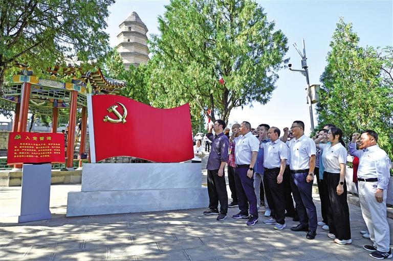 2023年6月30日,在陕西延安宝塔山参观的党员干部重温入党誓词。 新华社记者 张博文摄