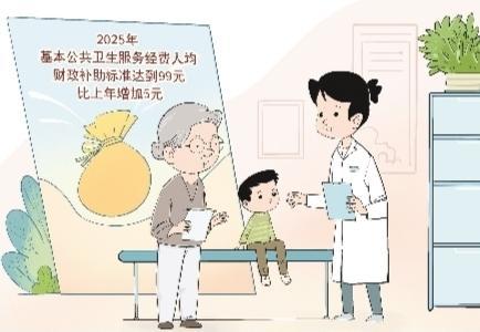 记者日前从国家卫生健康委获悉,2025年基本公共卫生服务经费人均财政补助标准达到99元,比上年增加5元。 据新华社发(勾建山作)