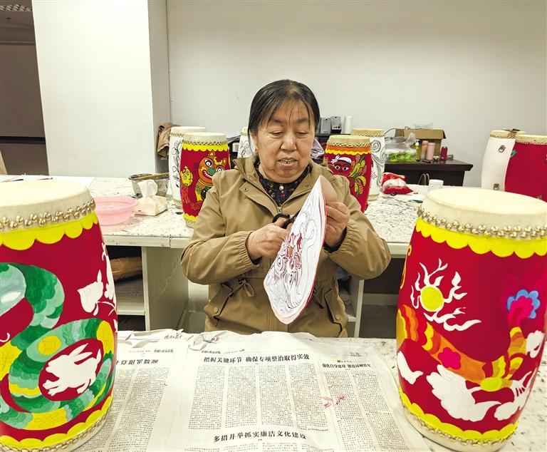 在安塞余泽玲民间艺术非遗工坊,安塞剪纸省级非物质文化遗产代表性传承人余泽玲在创作剪纸作品。 本报记者 张英摄