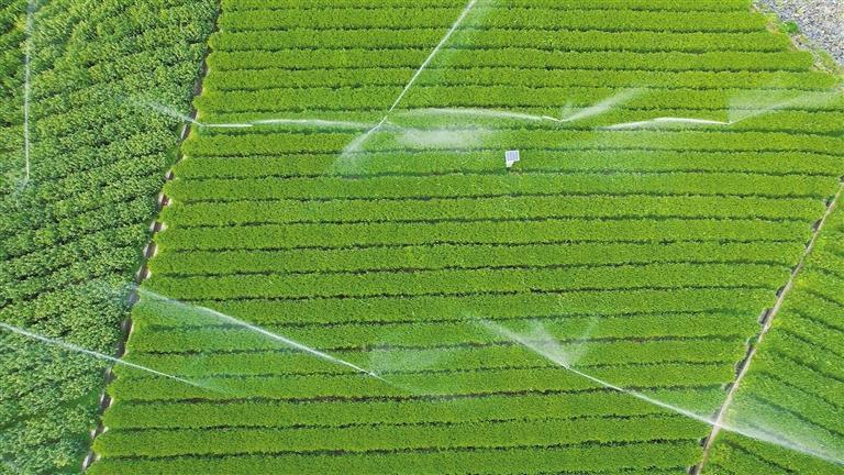 6月25日,笔者走进位于紫阳县焕古镇春堰村的智慧茶园,只见一排排茶树整齐排列,气象监测站、虫情测报灯等设备散布在茶园各处。工人轻点控制屏幕,喷灌系统立即启动。水雾弥漫在茶垄间,滋润着一棵棵茶树。