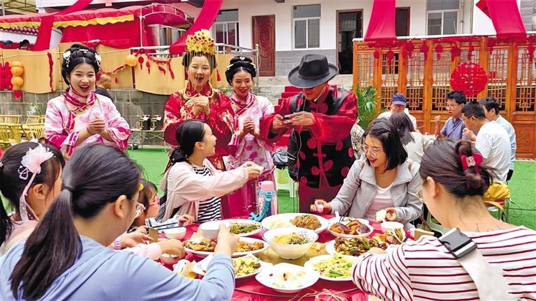 七月二日,佛坪老街流水席及非遗传统婚俗展演现场。 本报通讯员 祁淼摄