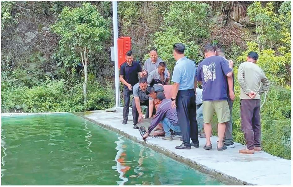 6月29日,陕西顺兴硒源农旅发展有限公司养鱼基地的工作人员在投放鲟鱼种鱼。 本报通讯员 邵欢摄