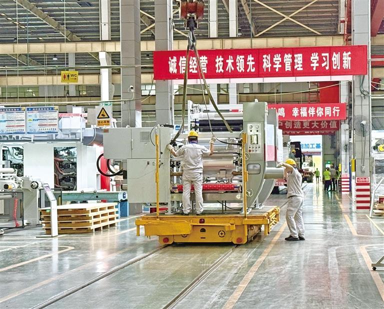 七月八日,在陕西北人印刷机械有限责任公司生产车间,工作人员在转运印刷机色组单元。 本报记者 李静茹摄