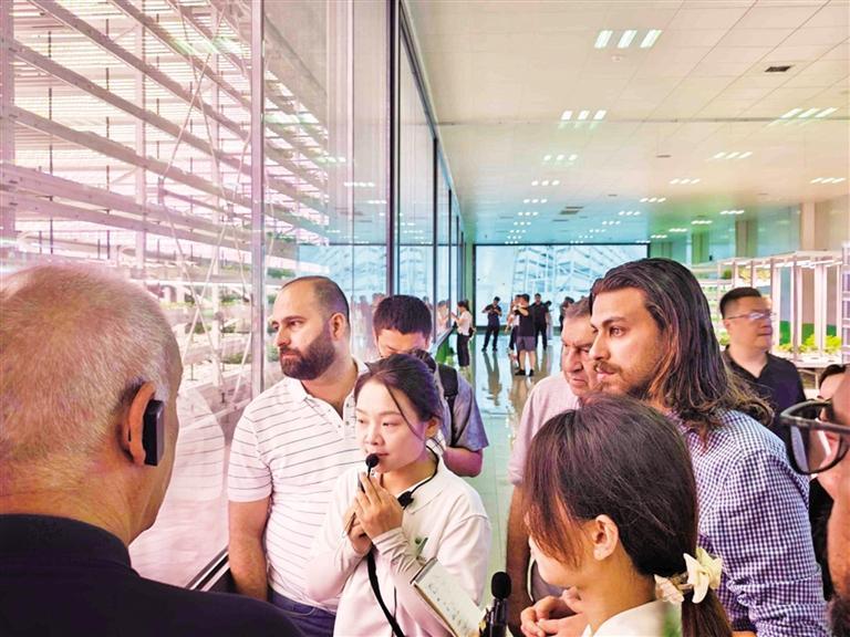 七月八日,在杨凌智慧农业示范园植物工厂内,工作人员向阿拉伯国家政党政要考察团介绍植物培育模式。 本报记者 王志辉摄