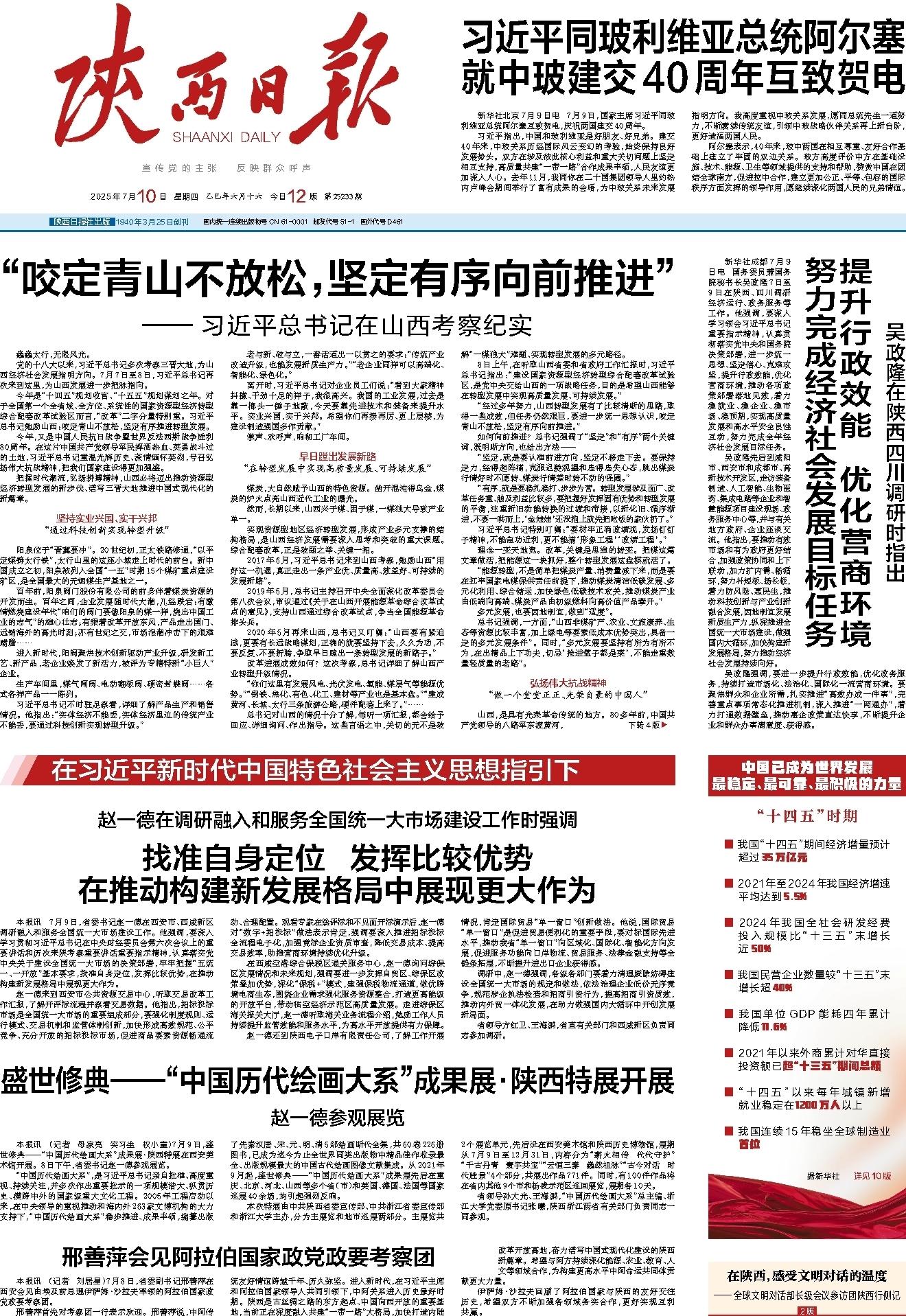 本报讯 7月9日,省委书记赵一德在西安市、西咸新区调研融入和服务全国统一大市场建设工作。他强调,要深入学习贯彻习近平总书记在中央财经委员会第六次会议上的重要讲话和历次来陕考察重要讲话重要指示精神,认真落实党中央关于建设全国统一大市场的决策部署,牢牢把握“五统一、一开放”基本要求,找准自身定位,发挥比较优势,在推动构建新发展格局中展现更大作为。