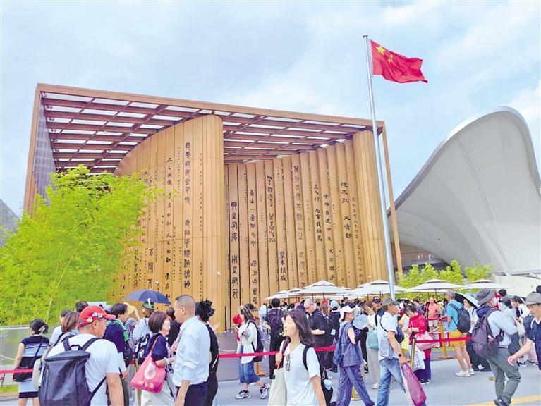 大阪世博会中国馆陕西活动周7月8日开幕。图为在外形如中华书简的中国馆外,观众排起长队。 本报记者 魏伟摄