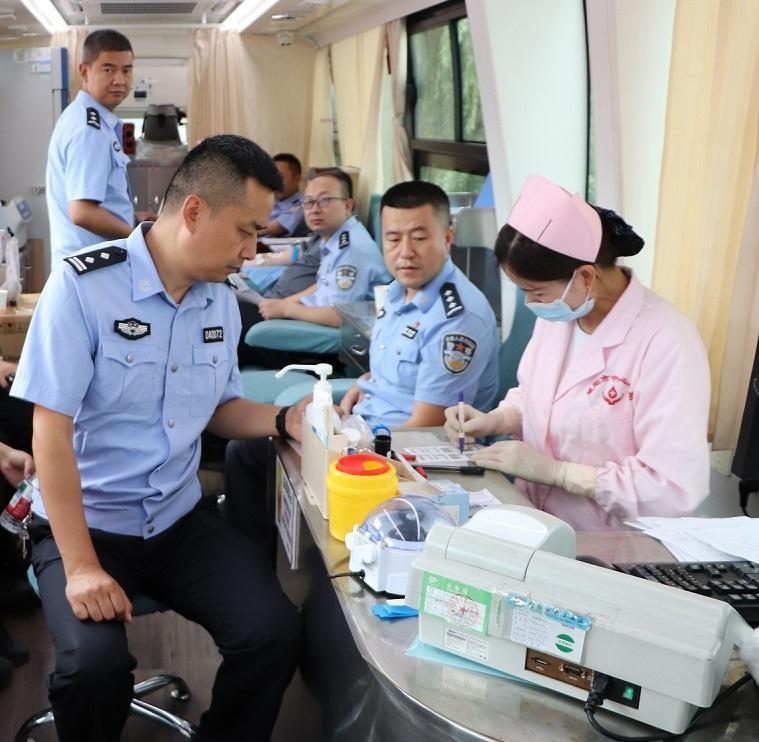 7月8日,彬州市公安局干警积极参与“为党旗添色 为生命护航”主题无偿献血公益活动。图为公安干警在献血车上排队献血。 本报通讯员 于国良摄