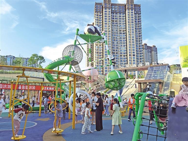 7月9日,汉中市汉台区滨江东路汉辉购物中心门前,在家长的陪同下,孩子们在游乐场玩耍。 本报通讯员 何祥弘摄