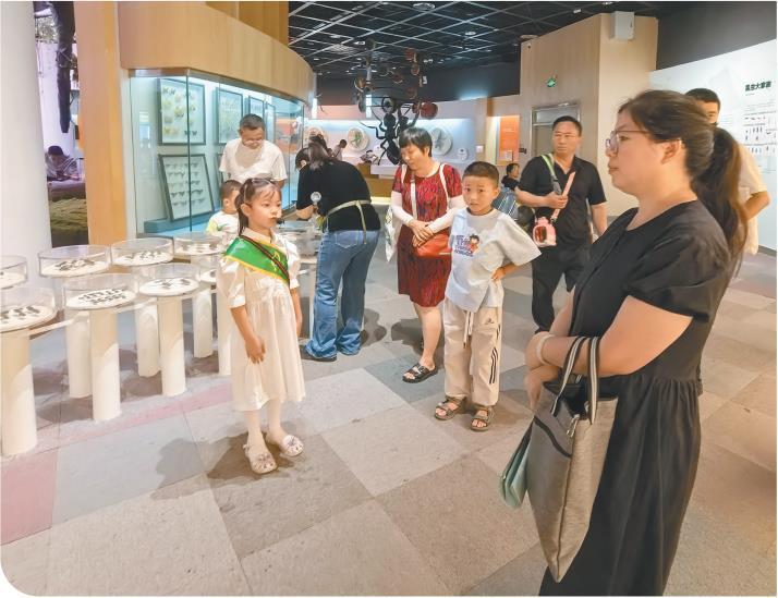 七月十三日,在陕西自然博物馆,小小讲解员通过情境演绎向公众进行科普。小小讲解员项目在陕西自然博物馆已开展十年,累计培养近两千名五岁至十二岁的讲解员。 本报记者 李羽佳摄