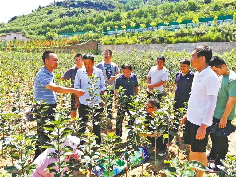 张诚(右二)给凤州村集体经济联合社的果农讲解苹果新优品种的繁育技术(资料照片)。 受访者供图