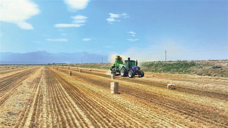 6月6日,在位于大荔县的陕西农垦沙苑农场的一处农田,打捆机在进行小麦秸秆打捆作业(资料照片)。 本报记者 吴莎莎摄