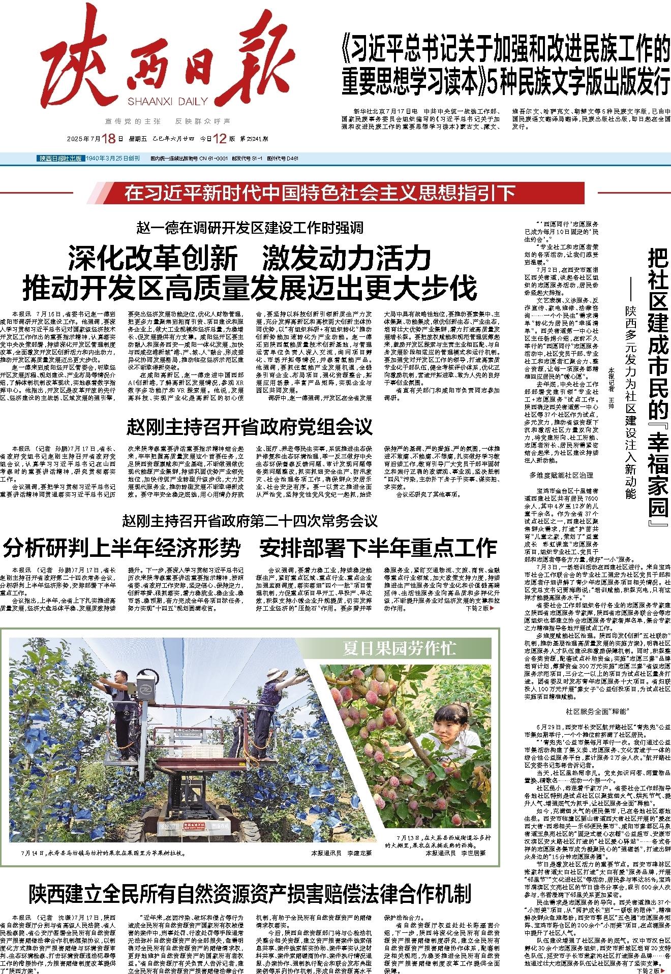 本报讯 7月16日,省委书记赵一德到咸阳市调研开发区建设工作。他强调,要深入学习贯彻习近平总书记对国家级经济技术开发区工作作出的重要指示精神,认真落实党中央决策部署,持续深化开发区管理制度改革,全面激发开发区创新活力和内生动力,推动开发区高质量发展迈出更大步伐。