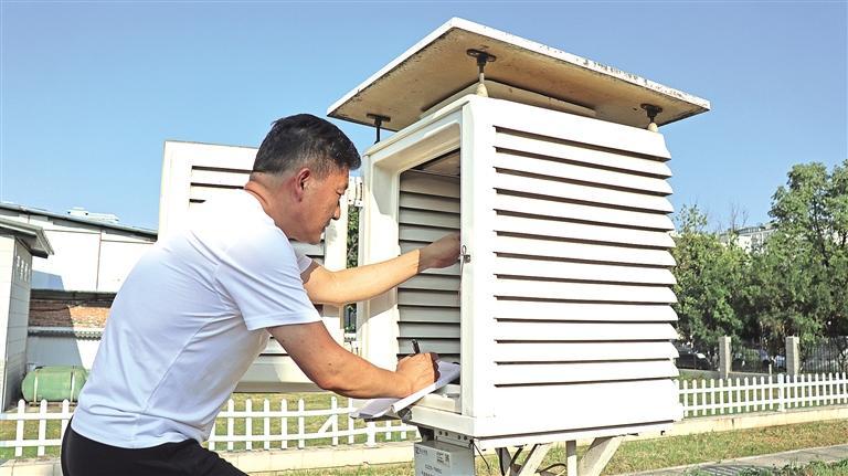 7月15日,汉台区气象局工作人员在维护百叶箱温湿度传感器,确保数据采集正常。 本报通讯员 马艳摄