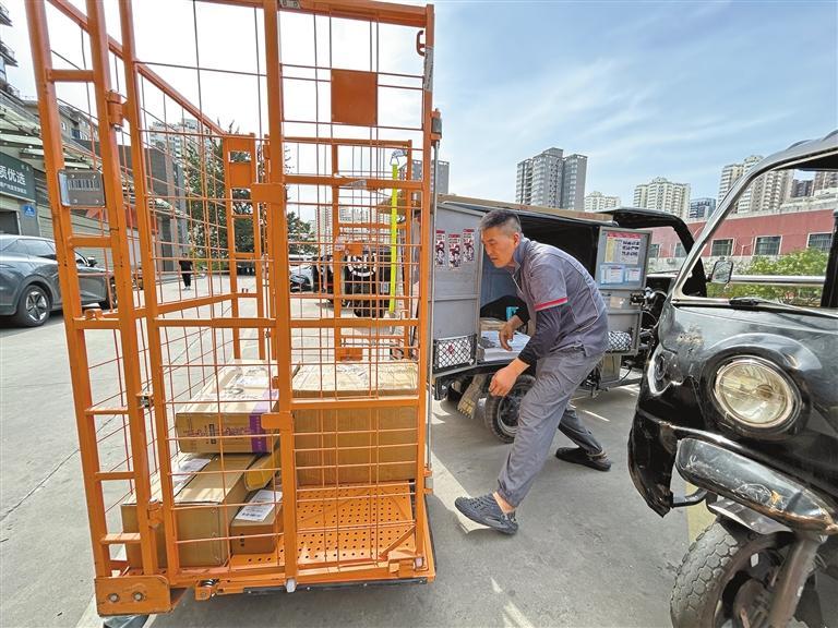 7月16日,在西安南郊一家快递配送站点,快递员正在装卸货物。