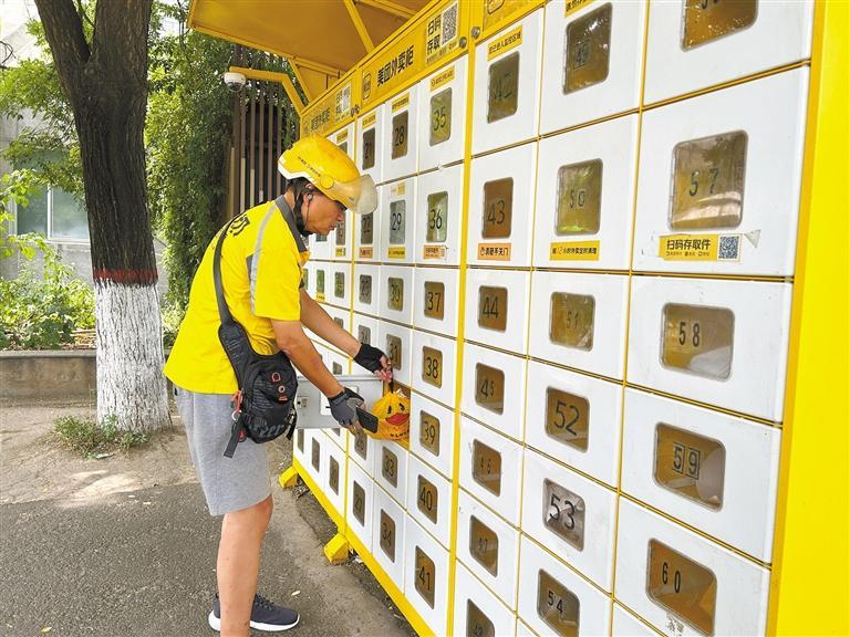 7月15日,在西北大学,外卖骑手根据系统提示将货物放到指定外卖柜里。