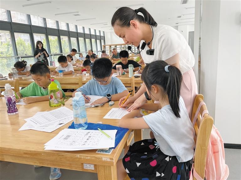 7月18日至20日,西安市碑林区图书馆开设“七彩小课堂之硬笔书法课”公益课程,帮助孩子们养成规范书写的良好习惯。图为课堂上,老师指导孩子们正确书写(7月20日摄)。 本报记者 杨小玲摄