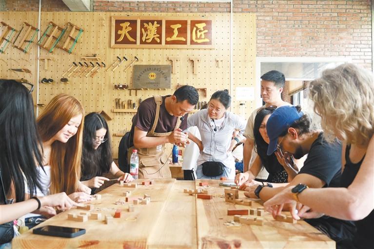 7月21日,汉中市汉文化主题“双赛”美国创作采风团40多名成员走进佛坪,探寻当地独特的人文底蕴。图为采风团成员走进佛坪县袁家庄街道王家湾村曲尺坊木工学堂,感受非遗榫卯工艺的魅力。 本报通讯员 曹钰宠摄