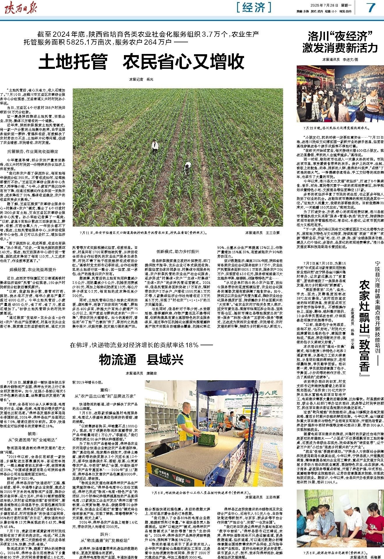 “从过去单打独斗的小农户经营,到如今服务带动的适度规模经营,农业社会化服务的蓬勃发展有效保障了粮食安全。如今,陕西正以农业生产托管为重点,推动农业社会化服务提质扩面,持续撬动乡村全面振兴的‘大变革’。”省农业农村厅相关负责人表示,延安市黄龙县、渭南市临渭区和合阳县、宝鸡市陈仓区、榆林市靖边县等地探索出的“农资+服务”“科技+服务”“互联网+服务”等模式,正在成为陕西农业增效、农民增收、农村发展的新引擎,持续为乡村振兴注入新活力。