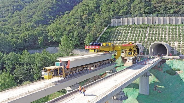 本报讯 (记者 杨光文/图)7月28日,随着架桥机将一孔长32.6米、重431.75吨的箱梁平稳落在西康高铁跨关中环线立交特大桥墩台上,由西成客专陕西公司建设、中铁一局集团有限公司承建的西康高铁桥梁架设任务全部完成,为后续无砟轨道施工奠定了坚实基础。