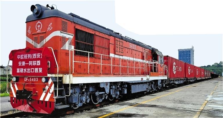 7月18日,安康龙王泉富硒矿泉水在恒口示范区搭乘“一带一路”铁海联运专列发往阿联酋(资料照片)。 本报通讯员 周亭松摄