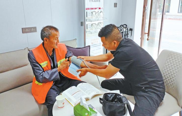 7月30日,延川县暖“新”驿站工作人员樊星星为环卫工人量血压。 本报通讯员 方大燕摄